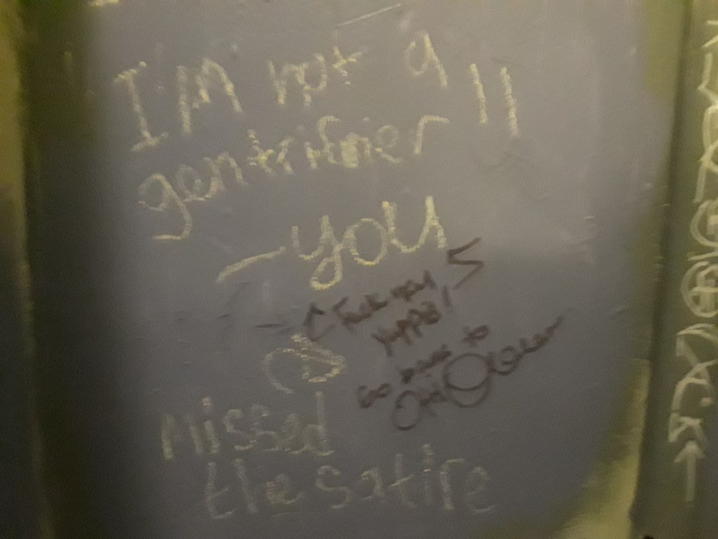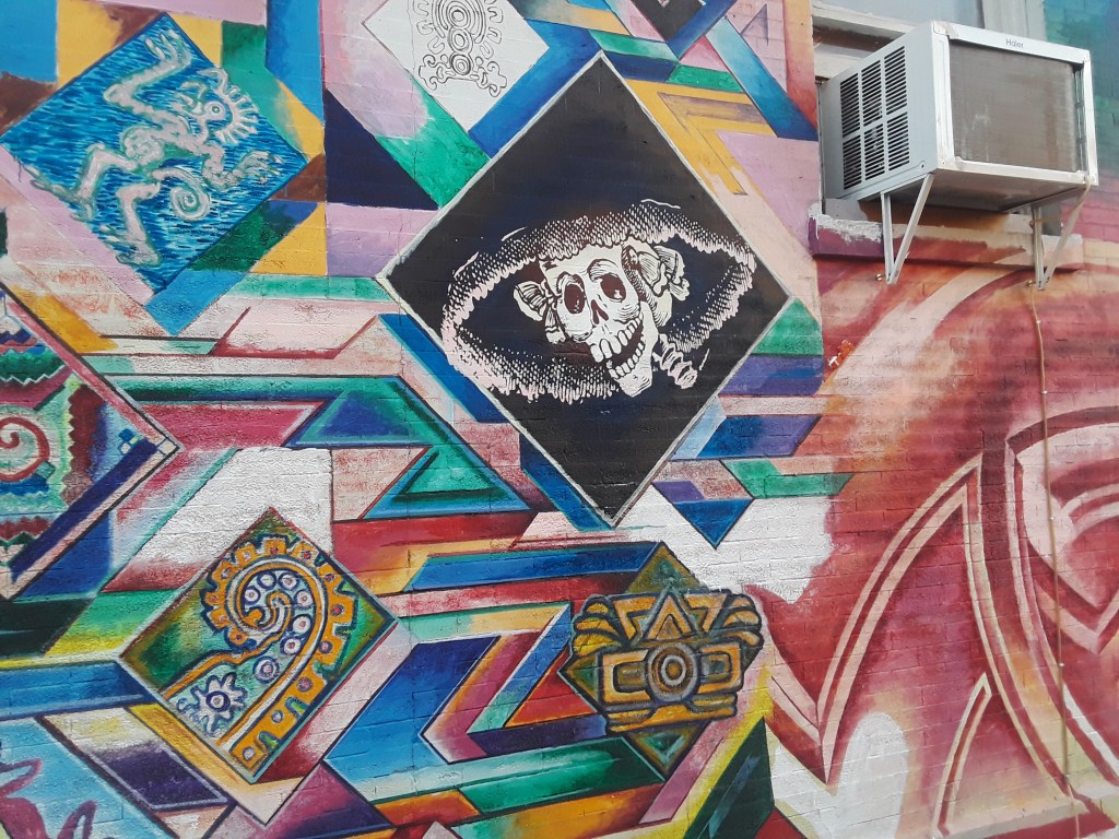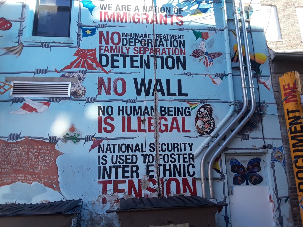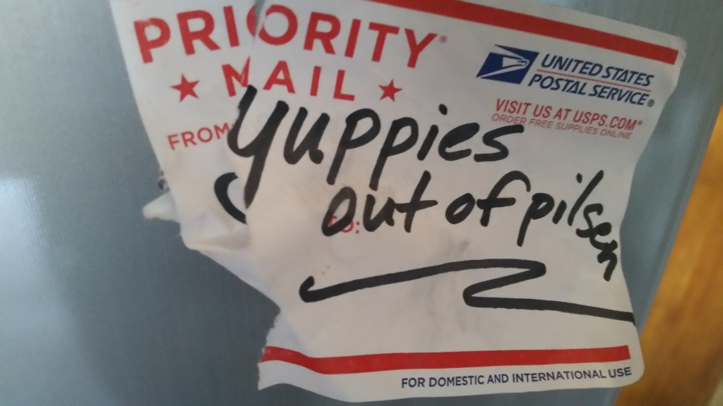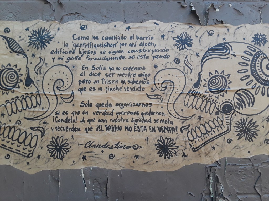Pilsen has been a Mexican American neighborhood for decades. Near The Loop and several downtown Chicago college campuses, as well as the bustling West Loop neighborhood, condos, coffeeshops, hip art galleries, and upscale restaurants have a significant presence. Murals and graffiti provide some illustration of the communities’ cultures and conflict.